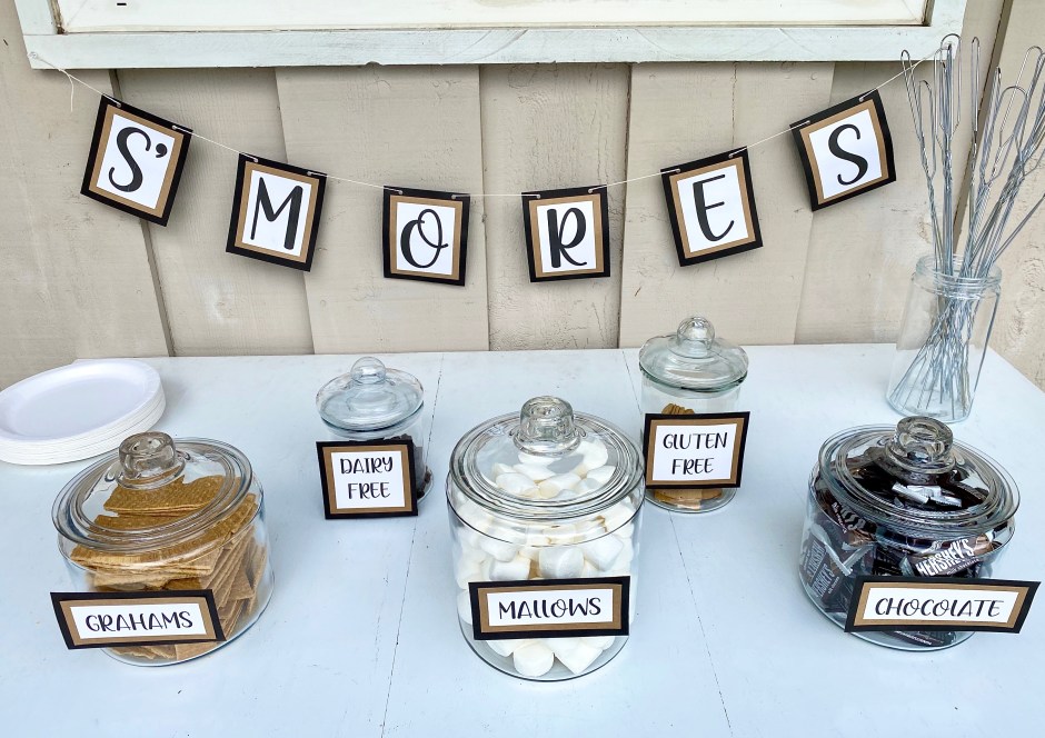 You can find a variety of sizes of glass storage jars and metal skewers on Amazon. I printed out letters for a “S’MORES” sign and some labels for the jars and then backed them with brown and black card stock. My son is gluten and dairy free, so I made sure to include gluten free graham crackers and dairy free chocolate options as well. #CommissionsEarned