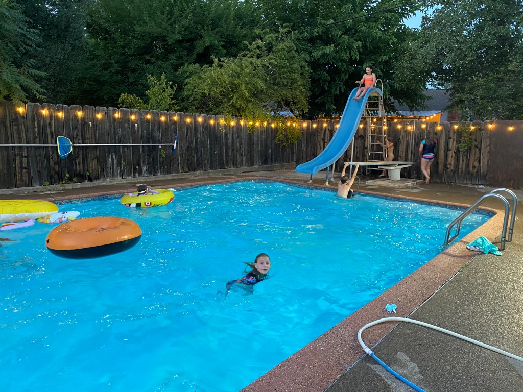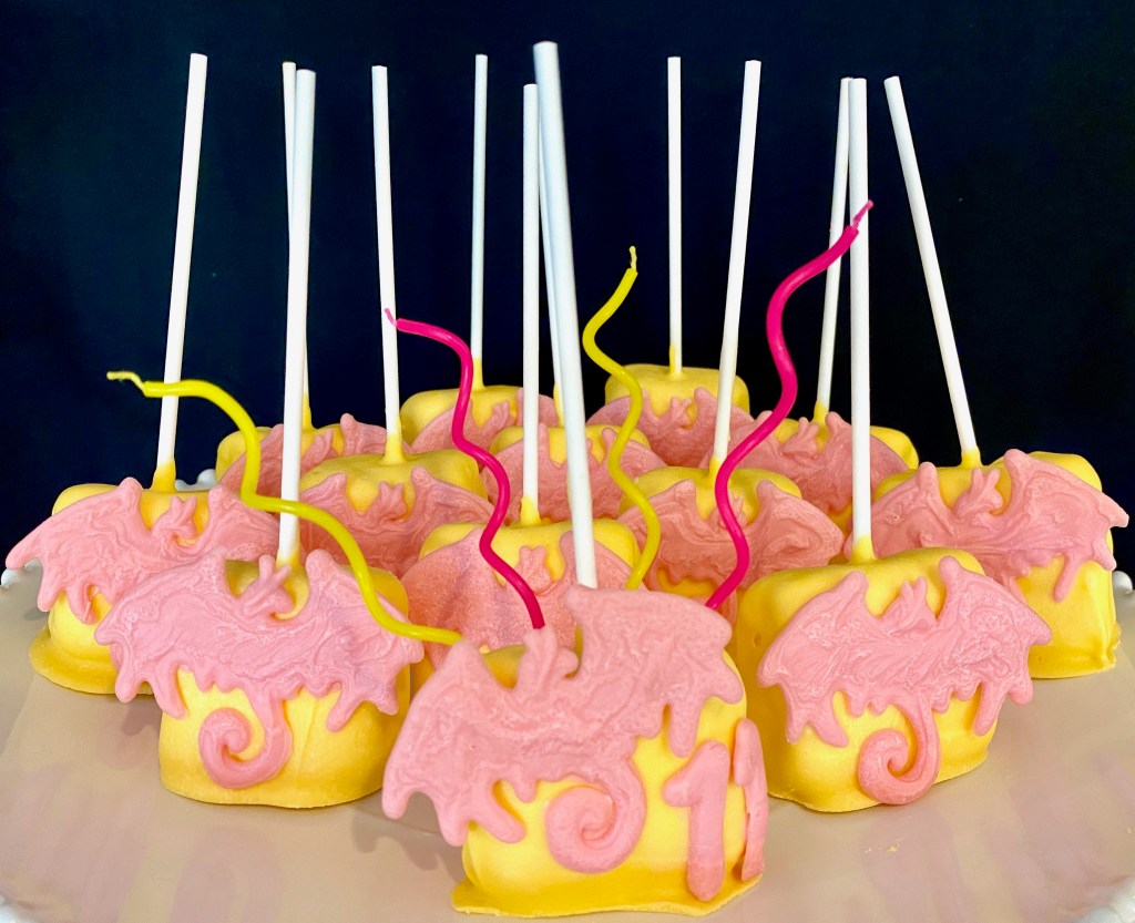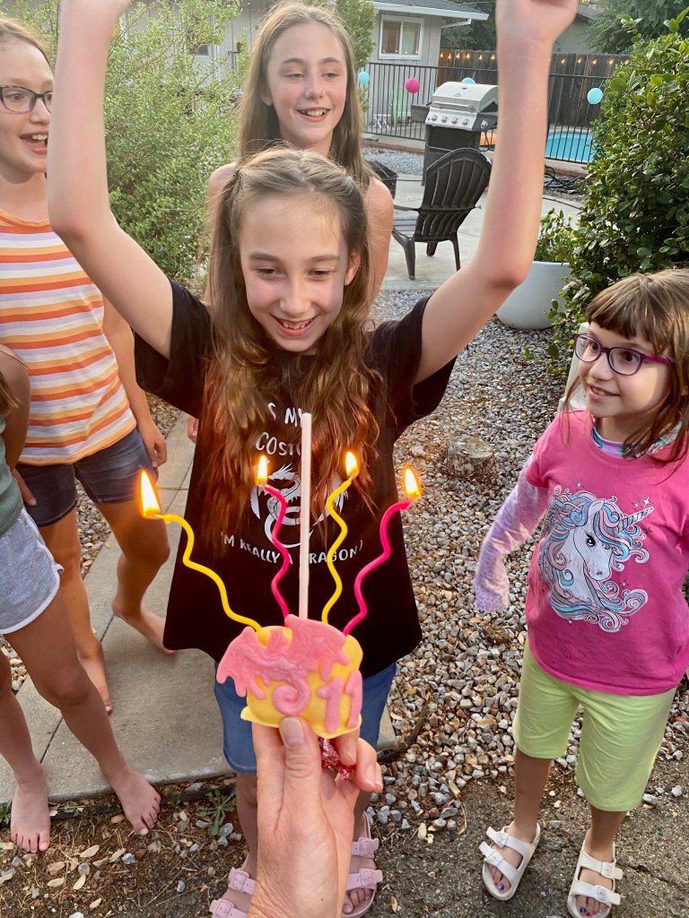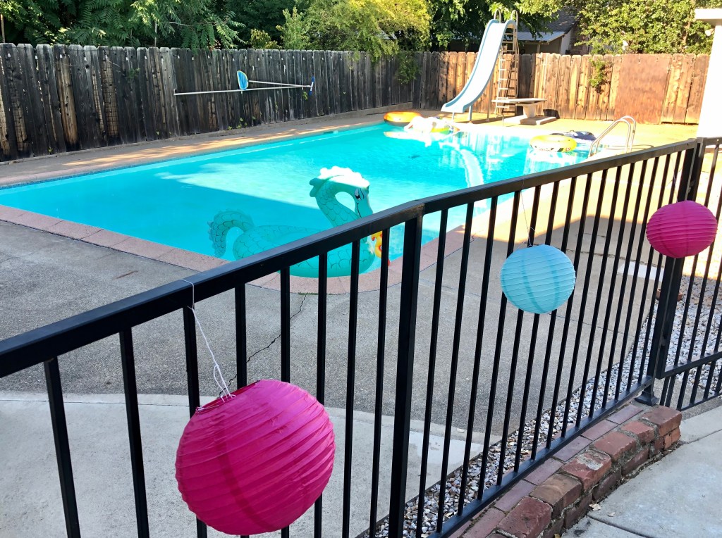 June weather can be hit or miss where we live, but on the day of Karis’s party it was over 100 degrees. We thought it would be fun and refreshing to end the evening with a night swim. I found the cutest dragon floaty at Target and decorated the pool fence with some more of the Dollar Tree paper lanterns in pink and teal. The kids were more than ready to cool off with a dip in the pool, but not before celebrating the birthday girl with her favorite treat, marshmallow pops with mini dragons made of Wiltons candy melts. #CommissionsEarned