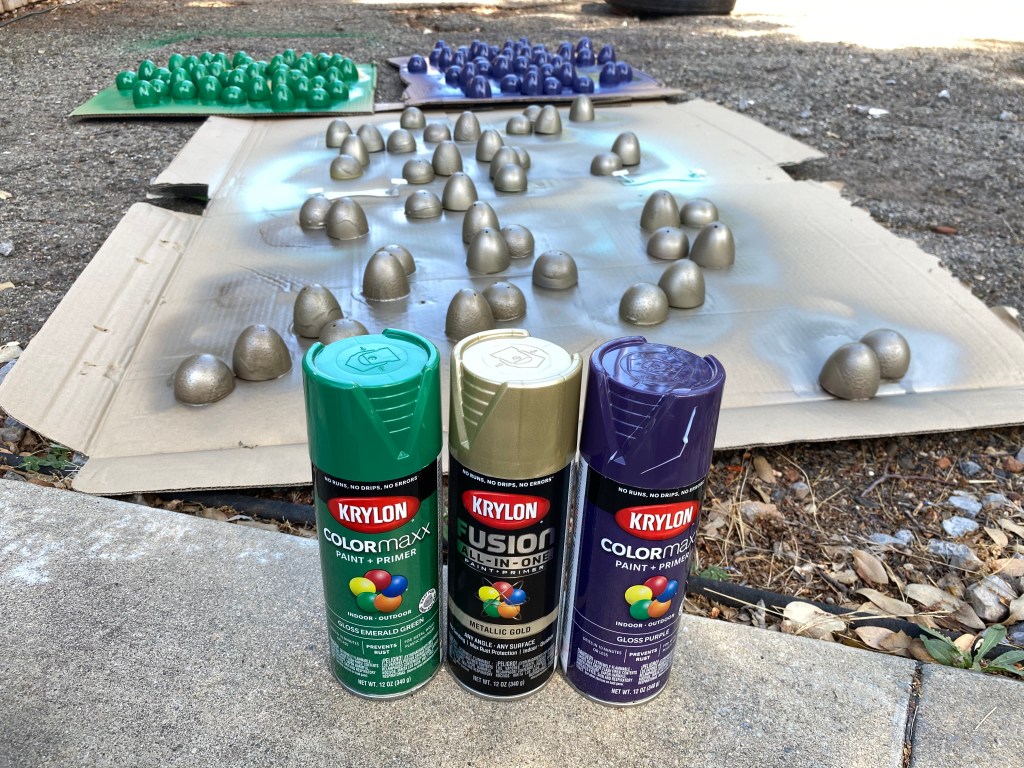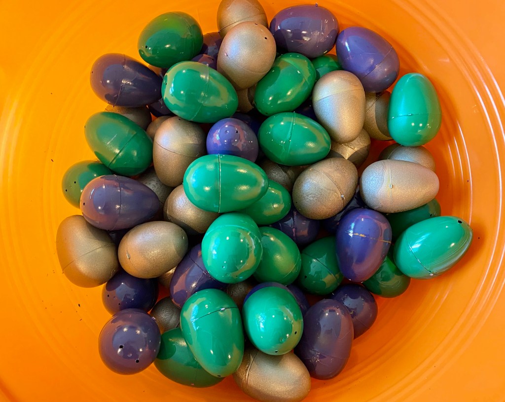Karis loves art, and always wants to incorporate some crafty activities during her parties. We decided on three things 1. A dragon egg hunt 2. Make a dragon eye ring, and 3. Paint a dragon silhouette. We had a ton of old plastic Easter eggs that we turned into “dragon eggs” with the help of some spray paint. Karis’s friend came over to help her stuff over 60 eggs with candy and the kids loved going on an egg hunt in June.