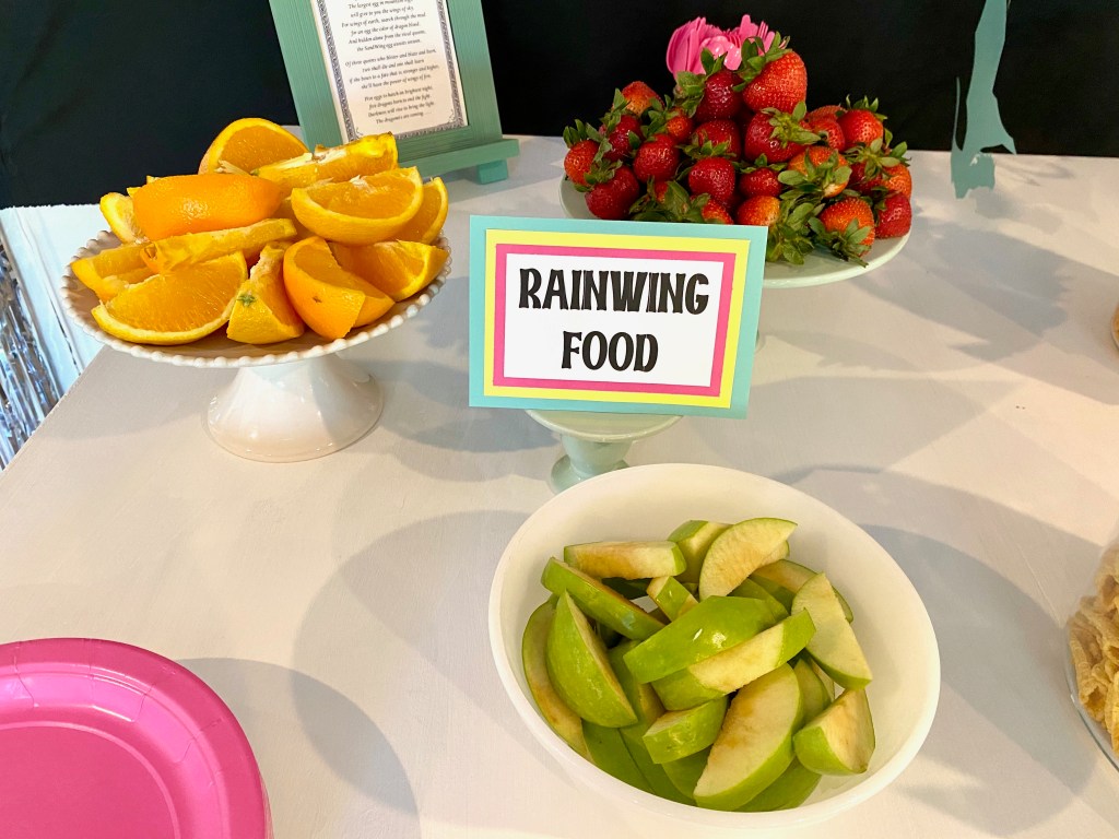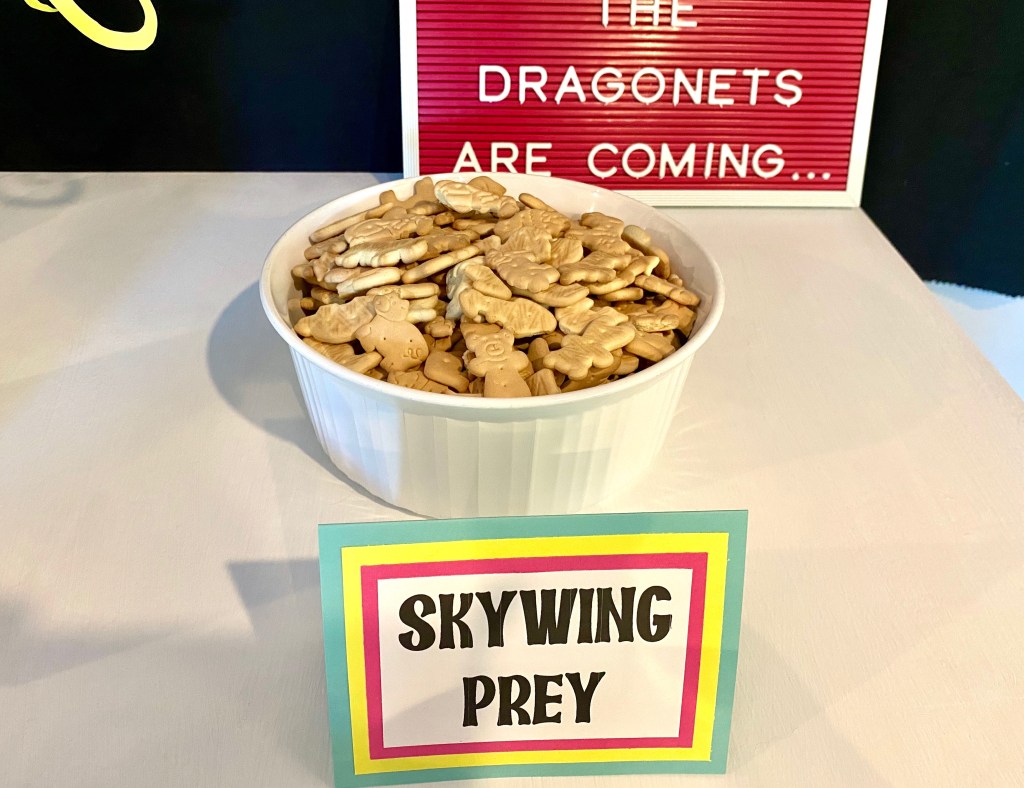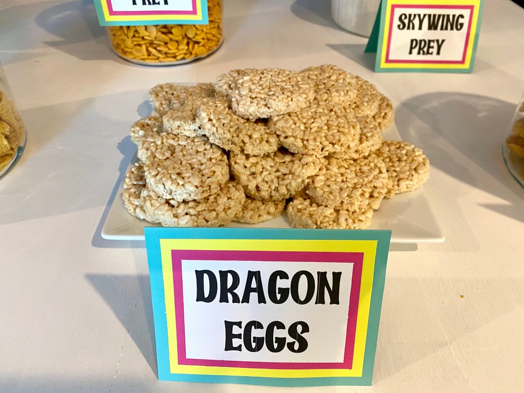 Karis and I browsed Pinterest for dragon themed food ideas and came up with some fun options including Dragon Egg rice crispy treats, Bugels as Dragon Claws, Dragon Scales (Fritos), and Goldfish Crackers for Seawing Prey. We cut up fruit for Rainwing Food and included animal cookies for the Skywing Prey. We also grilled up some hot dogs since her party was at dinnertime.