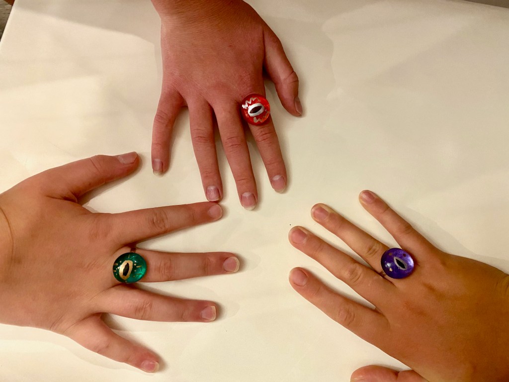 For the dragon eye rings, I purchased some clear beads, metallic paint and metallic sharpies, adjustable rings, and some jewelry bonding glue. The kids started out using a black sharpie to create a pupil on the round part of the bead, then added a metallic outline and flecks with the silver and gold sharpies. They painted over the flat part of the bead with a couple of coats of the paint color of their choice and let it dry for about an hour. Once dried, a dab of glue bonded it to the ring and they were able to go home with the coolest dragon eye rings.