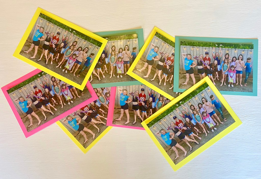 I made sure to snap a quick photo of all of the kids together before the night ended as this is my favorite way to make thank you cards. I order a set of prints from Shutterfly and back them with cardstock. Karis writes a little note to her friends, thanking them for the gift they got her and for coming to her party and they all have a cute photo capturing the fun they had.
