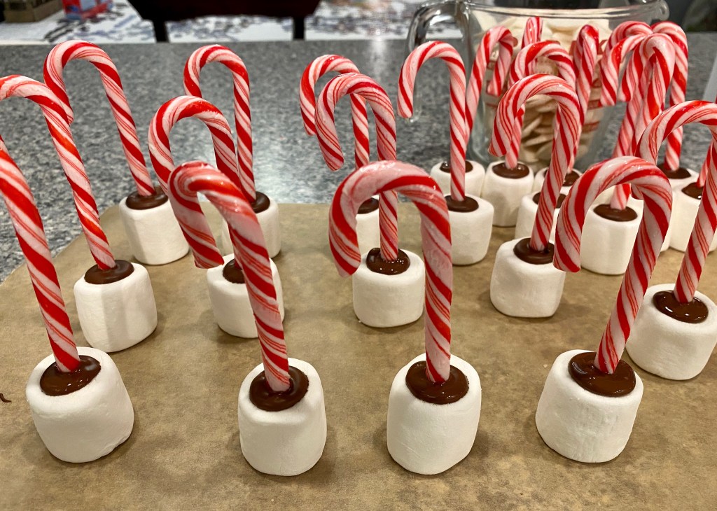 STEP 2: MELT A SMALL AMOUNT OF THE CHOCOLATE CANDY MELTS. DIP A CANDY CANE IN THE CHOCOLATE AND PUSH INTO THE CENTER OF THE MARSHMALLOW. REPEAT