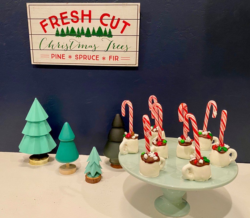These little Christmassy Pops are perfect for your holiday party or for adding to your plate of Christmas treats. I used a pretty cake platter in mint green next to my display of mini Christmas trees for some photos and then sent them off to be handed out at the Drive-Thru caroling event. #CommissionsEarned