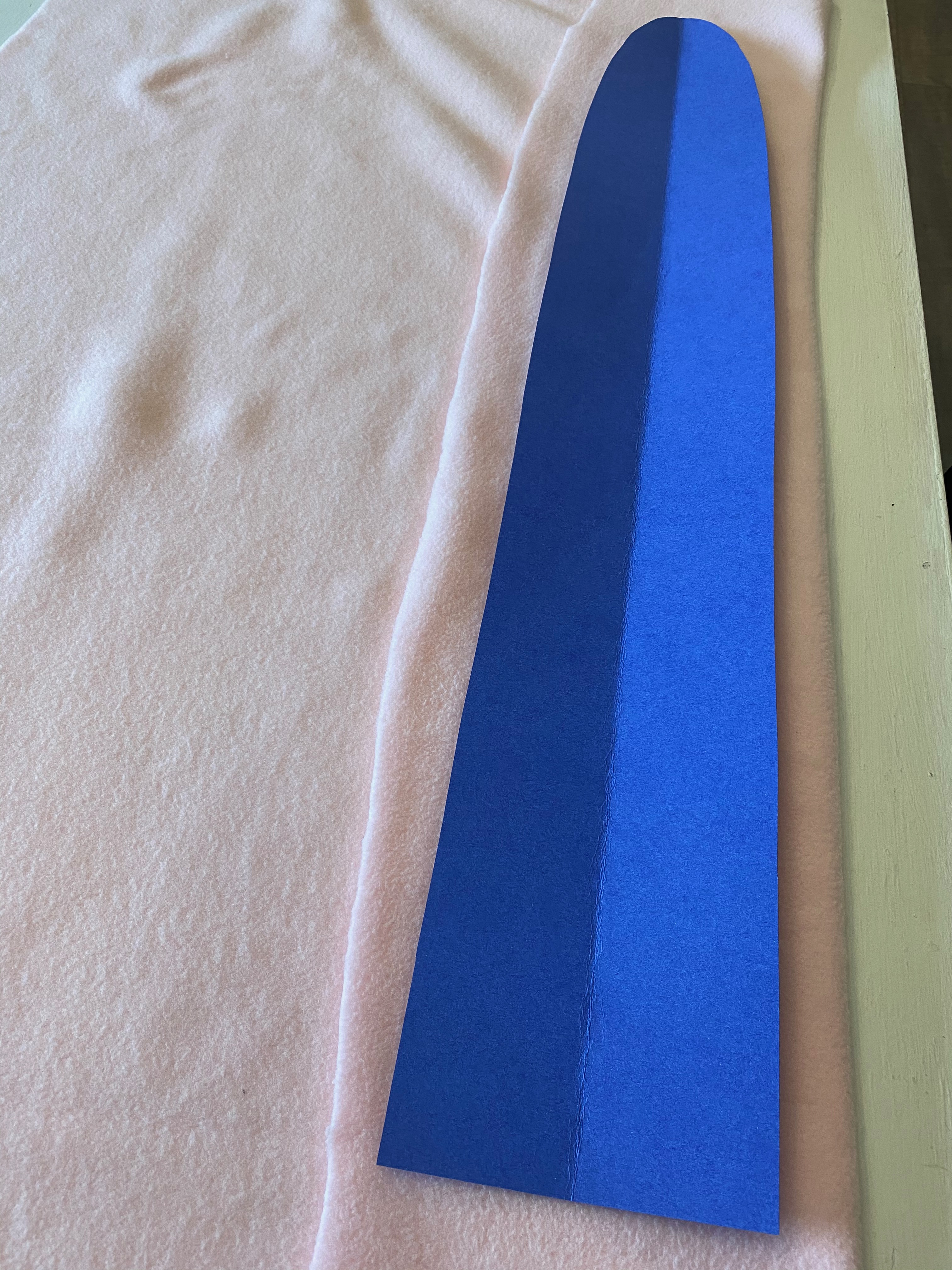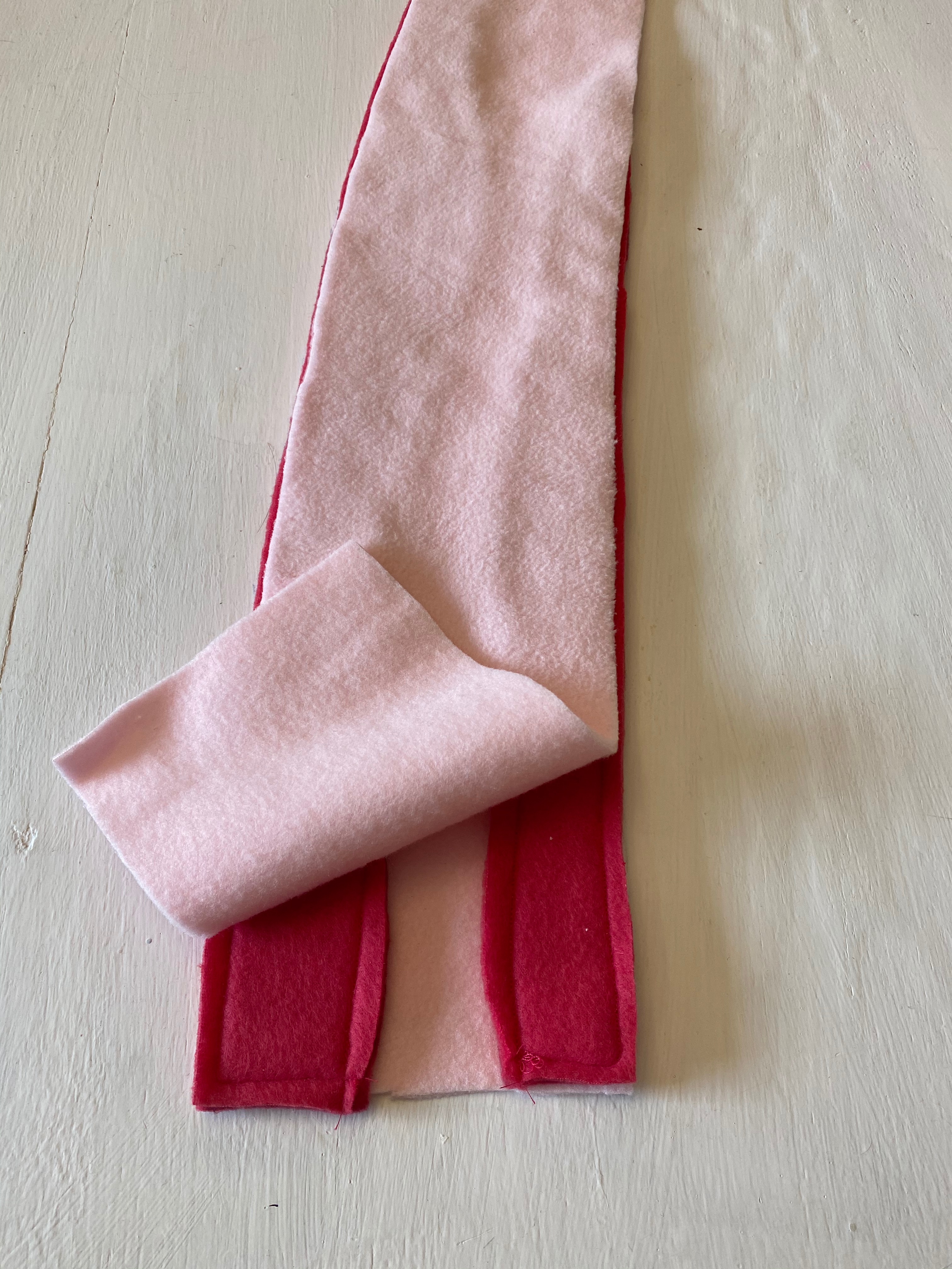 For the tail, I made another template that measured 4.5″ wide by 27.5″ long. I cut two pieces out of light pink felt. Then I cut some dark pink accents. Sew the accent pieces together to make them thicker. Place both accents in between the two light pink tail pieces and sew together. Now turn right side out and your tail is complete.