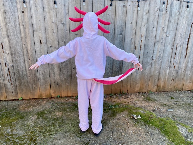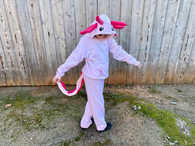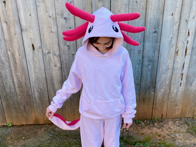 My daughter tends to pick the most obscure costumes that cannot be found anywhere in stores. Last Halloween she asked me to make her Appa from Avatar The Last Airbender. For “dress like your favorite book character” (Spirit Day) at school, she chose to be Kinkajou, the pink and yellow dragon from Wings of Fire, and this year, for Halloween, she wanted to be an axolotl.