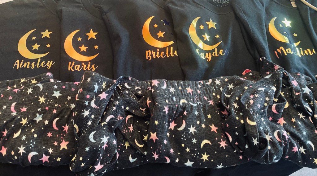 It was an unusually cool day in June this year, so we had to slightly modify our original plans. The girls actually braved the cold and jumped in the pool for a short swim. Fortunately, one of the things that I got for them was matching pjs, so they dried off after a bit and got comfy for the night. My husband got me a Cricut Maker 3 for Mother’s Day this year and I haven’t had a ton of time to use it, so I made sure to test it out on a couple of things for Karis’s party. I found some adorable moon and star pj shorts for a great deal at Walmart and bought plain black t-shirts to make personalized tops to match the shorts. I tried out holographic iron on for the first time and it was such a cool product. I found a free moon and stars SVG online and watched a few tutorials. I must say that for my first try at making shirts with my Cricut, it was pretty easy and I loved the way they turned out. #CommissionsEarned