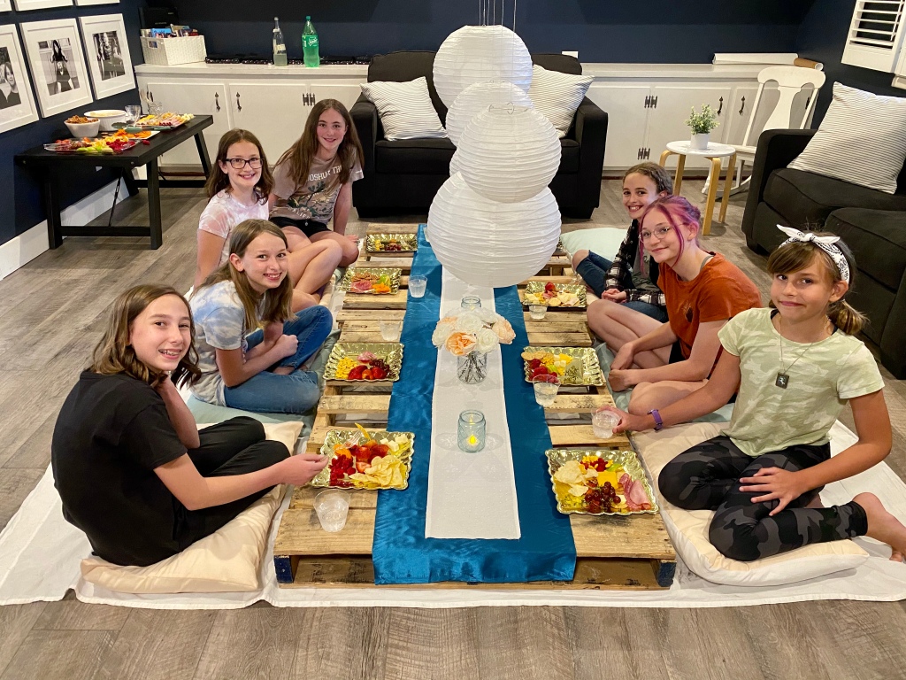I set the table a couple of days before the party so that I had plenty of time to get my house cleaned and to prep for the food and games. I found some amazing game ideas on Pinterest and hit up the Dollar Tree for supplies. Karis wanted to swim, make s’mores, and play games. We started the party at 5:00 pm and I put together a simple charcuterie board style dinner with a variety of meats, cheeses, crackers, fruits, and veggies. The girls loved eating a “fancy dinner” by candlelight (I turned the main light on to get this photo).