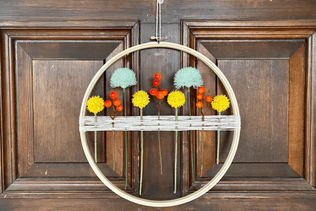 I already had a large wooden embroidery hoop and a ball of twine, so I just needed to purchase a few faux florals. I found these at my local Walmart, but you can order some similar yellow flowers here and orange berries here. #commissionsearned