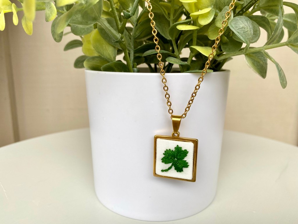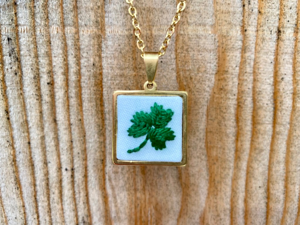 St. Patrick’s Day is just around the corner, and you may be thinking about what you have in your closet with a pop of green so that you don’t get pinched. Well look no further! Add a whimsical touch of green to any outfit with a gorgeous hand embroidered shamrock necklace, now available in my Etsy Shop.
