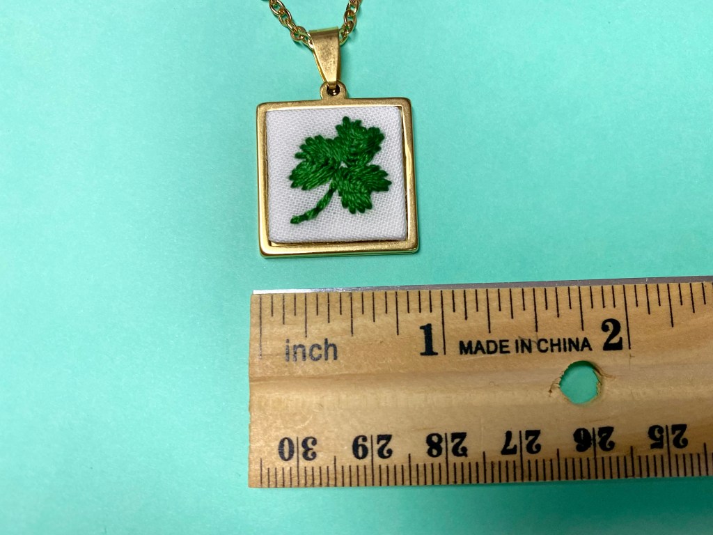 You can find these beautiful square gold bezels here and the gold chains here. They are both high quality and look amazing! I use E 6000 plus glue and white cotton fabric that you can find at your local fabric store. Any green embroidery floss will work for your tiny shamrocks. Just pick a color that you love and stitch away. #commissionsearned