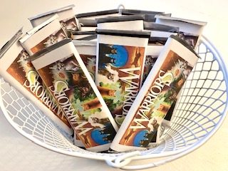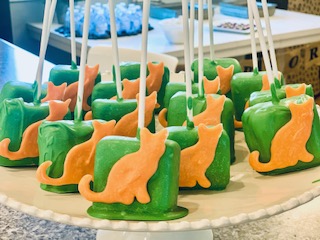 My daughter isn’t a huge fan of cake, so we always make marshmallow pops for her birthday treat. This year, I bought thebig square mallows that you can use for s’mores and covered them in green Wilton’s candy melts. I used orange candy melts to create little cat silhouettes and put them on the front for the tastiest birthday treats. And in case you are wondering where we got Karis’s ThunderClan T-shirt, I made it using a photocopied image as a template that I printed off from the computer and a small piece of black material. I then used Seam-A-Seam 2 light to iron it onto a white cotton tee after cutting it out of the black fabric. She has worn it many times since her party and it has held up really well.