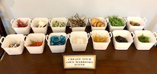 My favorite part of this party was “create your own Warriors scene.” Karis and I spent some time making multiple batches of green and brown play dough in the days prior to her party. We picked up some aluminum tins from the Dollar Tree and a bunch of nature materials. At the Dollar Tree we found blue glass beads to use as water, mossy rocks, leaves, fake flowers and plants, and a variety of rocks. I grabbed some wood rounds and plastic cats from Michael’s and collected twigs from the yard and let the kids use their imaginations to create their very own Warriors scene. They used the brown play dough as dirt and the green as a base for grass and built from there. Each one was unique and they all turned out amazing. I even picked up some little plastic garden signs so that they could name their creations. #CommissionsEarned