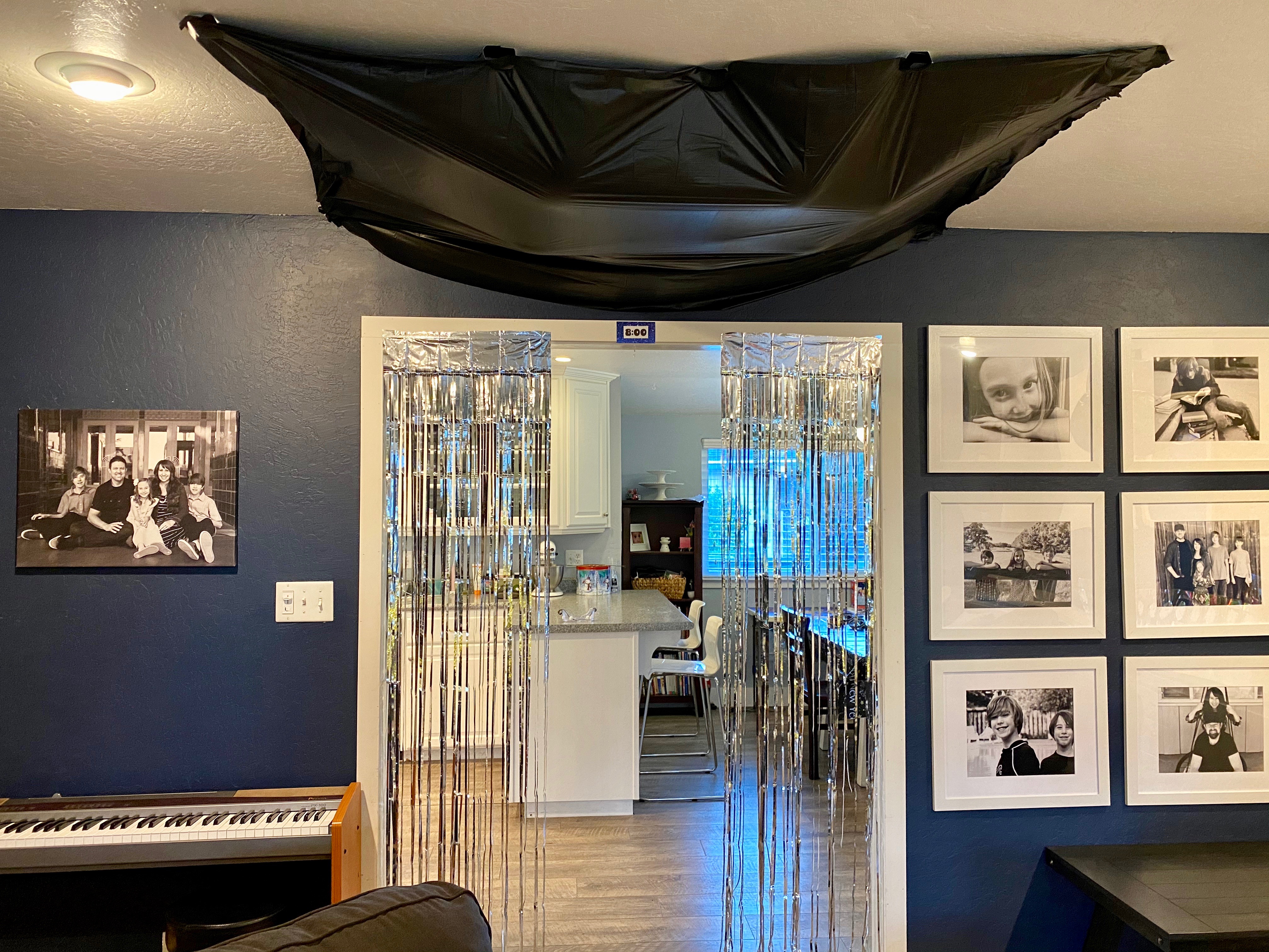 I am always looking for any opportunity to make memories for my kids in creative ways, so earlier this month, when my daughter started talking about Halloween movies that she likes, I suggested that we host a movie night on the weekend before Halloween. I’m not a fan of super scary, especially for middle schoolers, so we decided on Tim Burton’s The Nightmare Before Christmas and went to town browsing Pinterest for fun ideas. I found a super cute and inexpensive backdrop on Amazon and gathered a few things that I already had: white lights, a black backdrop, and a plastic pumpkin. I grabbed a purple plastic tablecloth, a black and white striped runner, popcorn boxes, and some black bowls and made some really fun food labels with names of the movie characters. I also printed off Jack & Sally faces to hang from the ceiling and I made a door hanger, using my Cricut Maker 3, with a black chalkboard style hanging that I found at the Dollar Tree and white vinyl. I’ve included the PDF of the printables that I created for you to use for your own party. #commissionsearned