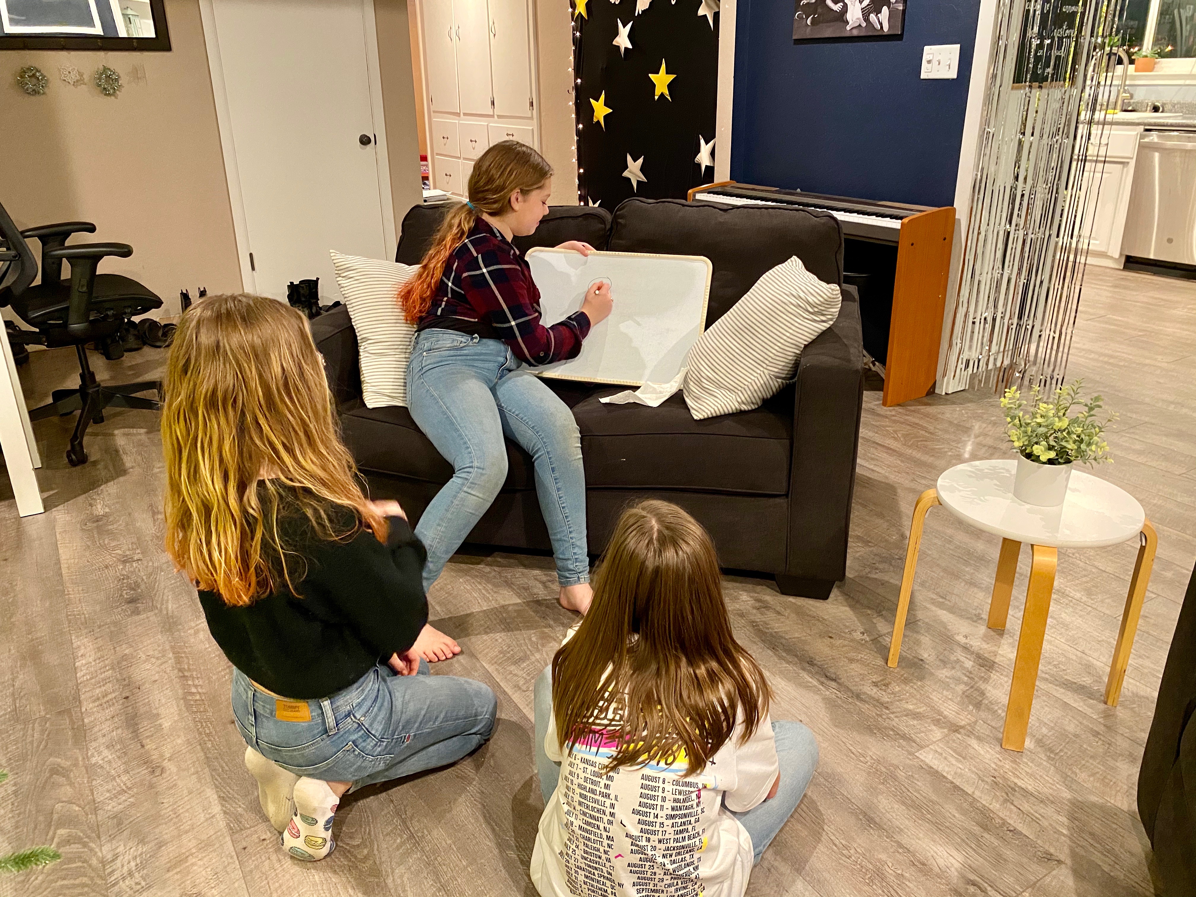 This is where that extra 30 minutes would have come in handy. Unfortunately, we ran out of time for all of the kids to read their telephone stories, so they just had them read their original phrase and the last phrase to see how much it had changed. It was still a ton of fun and I love that the entire group of kids sat and played together. I definitely see us hosting more movie nights with this amazing group of kids in the future. My daughter was smiling from ear to ear the whole time and I had so much fun with all of the party prep. It was a win-win for sure!